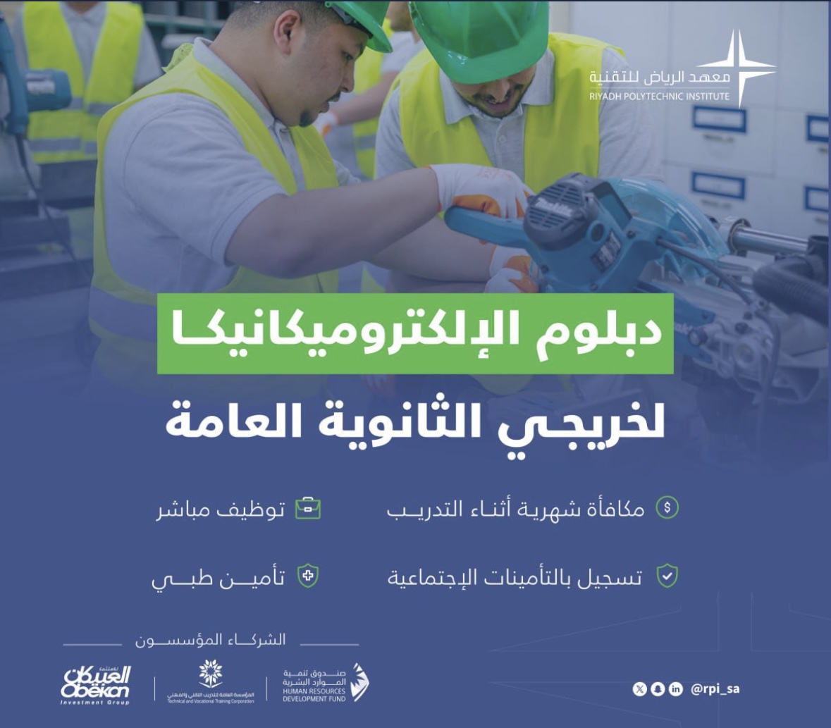يعلن (معهد الرياض للتقنية) عبر حسابه الرسمي (تويتر) عن بدء التقديم على برنامج (دبلوم الالكتروميكانيكا) للعام 2025م، وذلك وفقاً للتفاصيل والشروط الآتية.