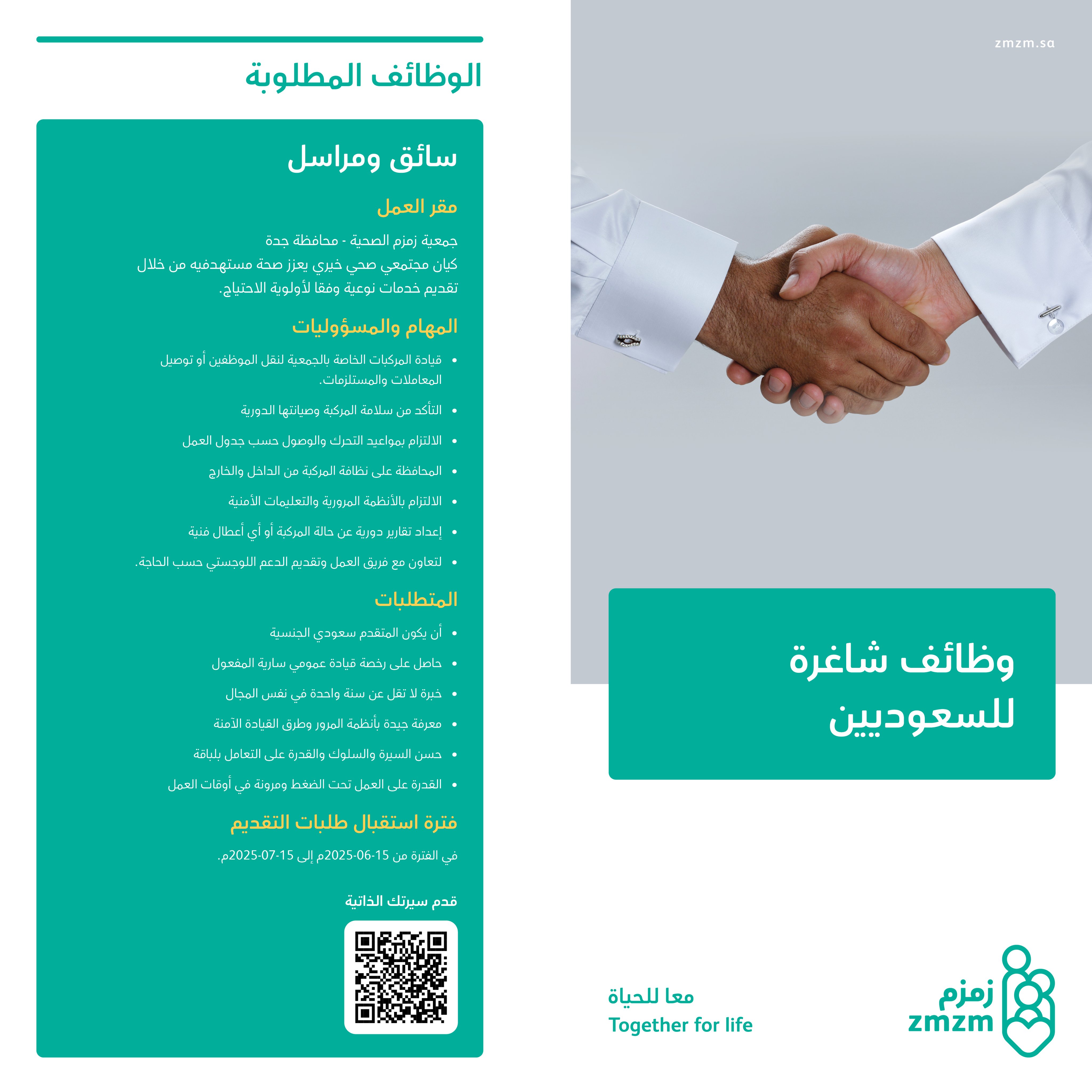 وظائف سائق ومراسل لجميع الشهادات في جمعية زمزم الصحية بجدة