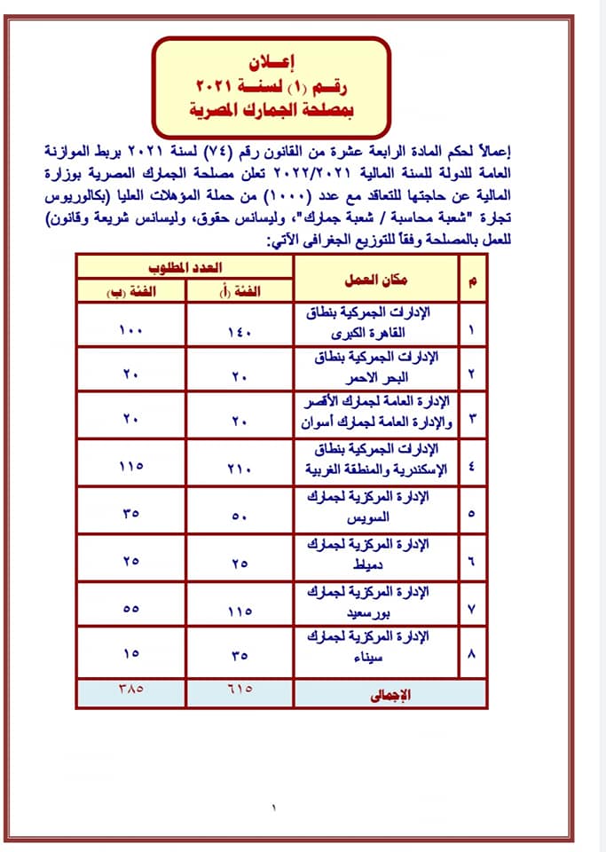 إعمالاً لحكم المادة الرابعة عشرة من القانون رقم( ٧٤) لسنة ٢٠٢١ بربط الموازنة العامة للدولة للسنة المالية ٢٠٢١/٢٠٢٢ تعلن مصلحة الجمارك المصرية بوزارة المالية عن حاجتها للتعاقد مع عدد( ١٠٠٠) من حملة المؤهلات العليا (بكالوريوس تجارة “شعبة محاسبة / شعبة جمارك”، وليسانس حقوق، وليسانس شريعة وقانون) للعمل بالمصلحة وفقاً للتوزيع الجغرافى الموضح بالملف المرفق